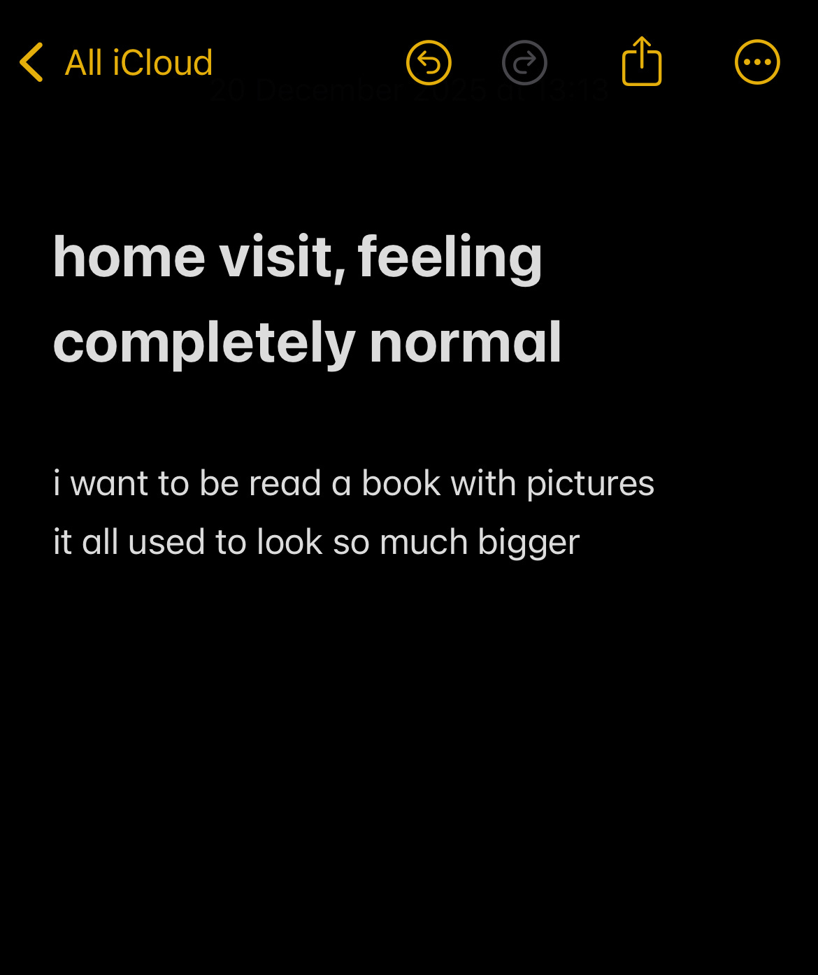 There’s a desperate, almost frantic missing for the old house when I do this, the panic of realising you didn’t realise the last time you’d do something, and that the object of your yearning is now distantly out of reach. But it’s good, really, for the place to have been changed. If it were all the same I doubt I’d be able to even cross the threshold, doomed instead to loom like a vampire in the doorway, seeking permission, waiting for my Oma to come back around the corner as she’s meant to, waiting for her to bring me in, bring me home.